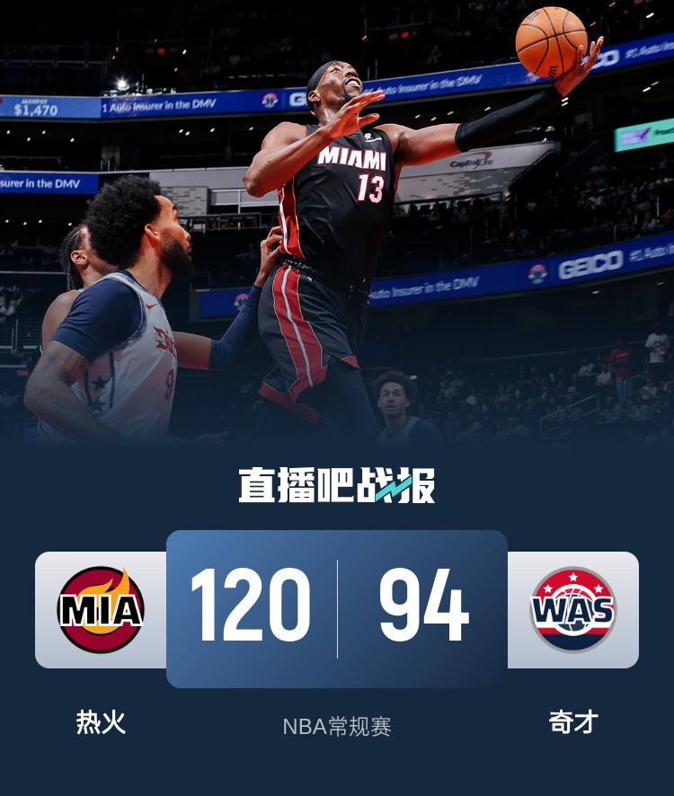 阿德巴约28+12+5 希罗27+5+5 普尔35分 热火大胜奇才迎5连胜