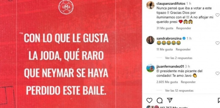 在INS上,米莱嘲讽了本场比赛缺阵的内马尔,他写道:内马尔是如此热爱聚会,他这次缺席让人感到奇怪。