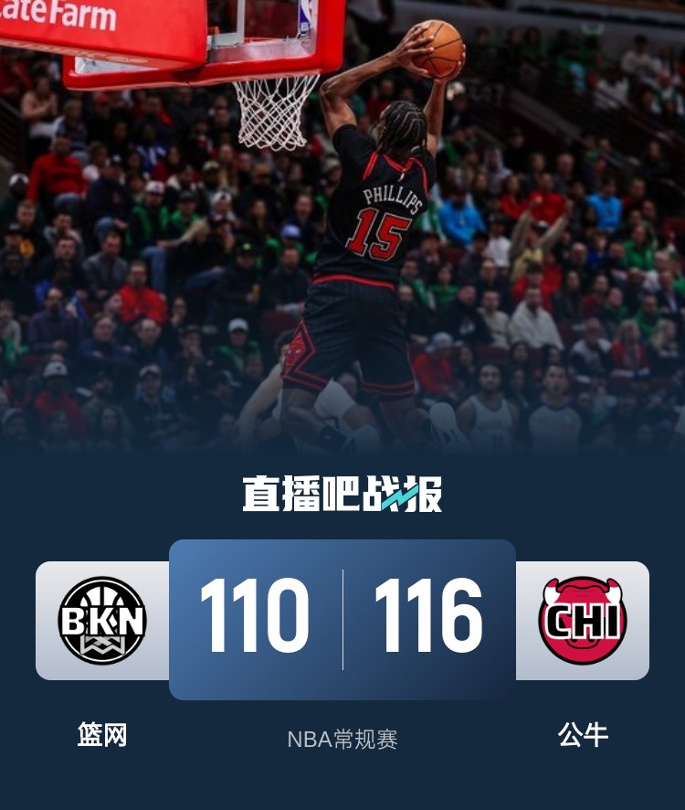 易边再战,篮网在第三节初段打出9-2的小高潮,一举将领先优势扩大到两位数。公牛在怀特的带领下奋力追分,双方围绕10分左右的差距展开拉锯战。末节风云突变,篮网进攻突然哑火,半节时间仅得3分,公牛抓住机会打出15-3的攻击波,一度反超比分。关键时刻,许尔特连续两次面对拉塞尔完成关键上篮并打成2+1,帮助公牛将领先优势扩大到8分。最终,公牛以116-110逆转篮网,豪取四连胜。