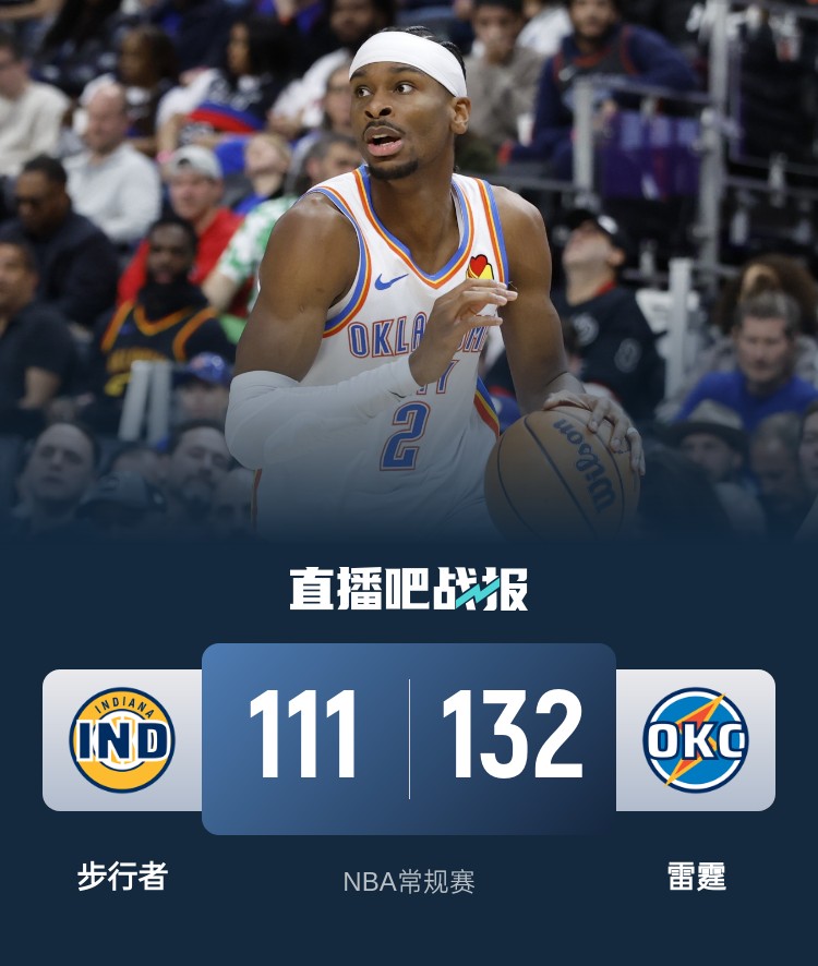 开场后西亚卡姆和哈利伯顿轮番发挥帮助步行者抢占先机,雷霆轮换阵容状态出色追上比分。第二节上来杰伦-威廉姆斯表现强势接连冲击内线拿分,步行者也是毫不示弱连续回应,但第二节后半段步行者进攻断电,雷霆趁机将比分拉开。易边再战,雷霆攻势依旧凶猛,虽然哈利伯顿带队努力追分,但杰伦-威廉姆斯冲击力凶猛,他联手乔在第三节结束前又掀起一波攻势将分差拉大到20分以上。最后一节步行者努力外线连续三分追分,但亚历山大和多特总能及时回应,场上分差一直在20分以上,最终雷霆132-111大胜步行者豪取9连胜。